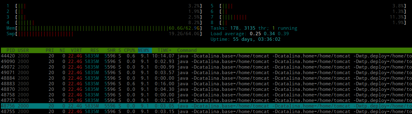 最近服务器的内存又在狂飙了,网关响应缓慢,Jenkins完成构建需要长达2个多小时。到底疯狂到什么程度呢?用htop命令看看: