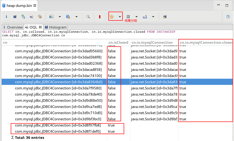 点击MAT的菜单File -> Open Heap Dump选择文件heap-dump.bin载入转储分析文件,然后,通过OQL(SELECT cn, cn.isClosed, cn.io.mysqlConnection, cn.io.mysqlConnection.closed FROM INSTANCEOF com.mysql.jdbc.JDBC4Connection cn)得到MySQL Connection对象如下: