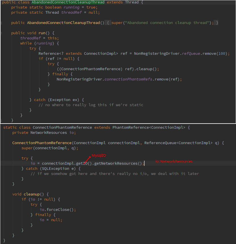 com.mysql.jdbc.NonRegisteringDriver.ConnectionPhantomReference为虚引用类java.lang.ref.PhantomReference的扩展类,其将在java.lang.ref.Reference.ReferenceHandler#run中等待JVM启动GC时进行清理活动。