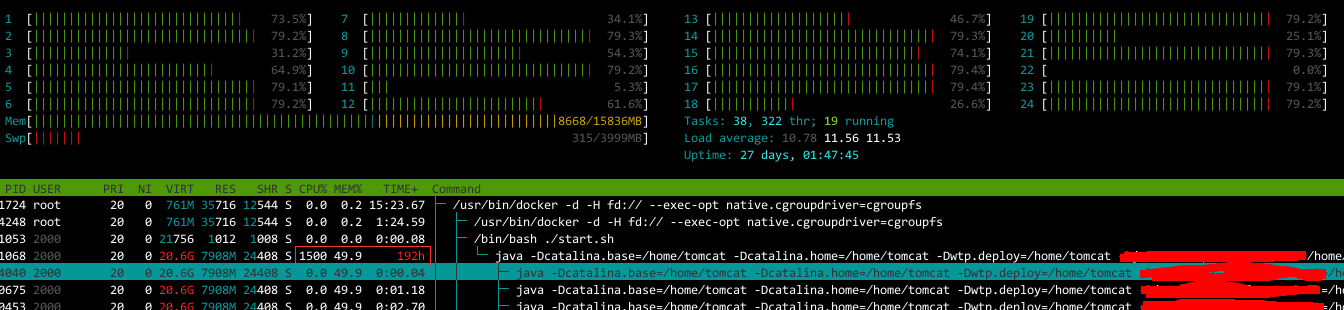 从图中可以看到,Tomcat进程占用了接近50%的内存(8G+),这对仅有少量访问的应用来说是很不正常的。