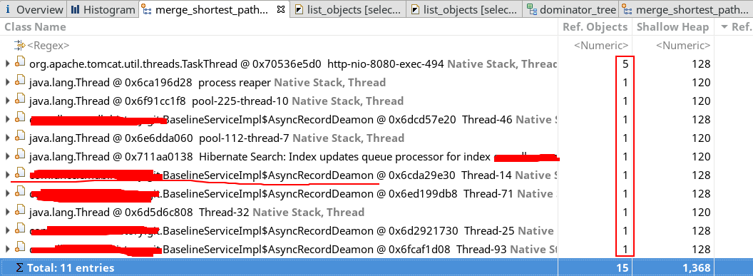 从结果中可以看到,Class Loader实际被11条线程所引用,通过名称可以判断有5条是应用所创建的Deamon线程,以及一条Hibernate Search线程和一条Tomcat的线程。