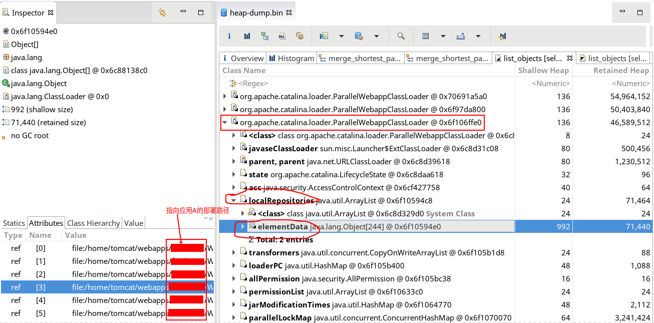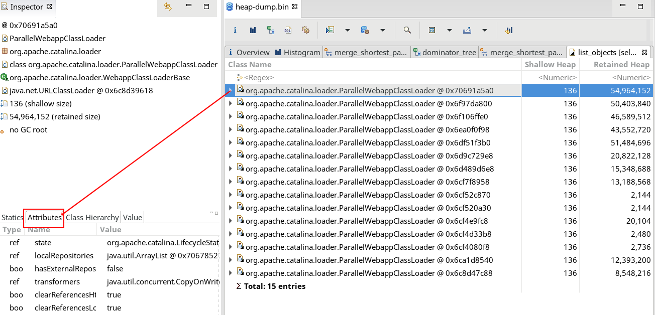 这里的几个数字也很值得关注:8,7,5。正常情况下,Tomcat应该创建5+2(5个Tomcat自带应用,2个业务应用)个Class Loader,这正好是7个活跃态的Class Loader。那么,现在的这15个Class Loader都对应了哪些应用呢?