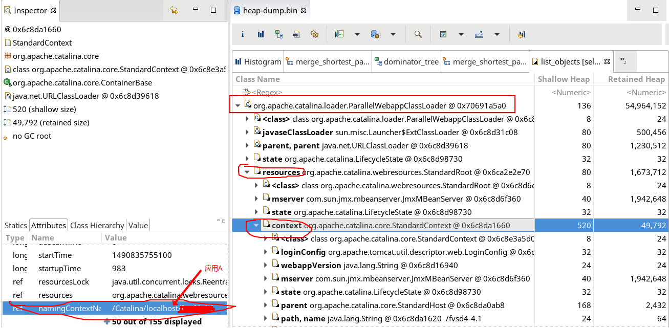 有过以编码方式内嵌Jetty等Servlet容器开发经验或者阅读过Tomcat源码的开发者应该知道,Servlet容器一般会有一个Context对象用以记录加载的webapp的名字、目录等信息,而Tomcat的该类的实现为org.apache.catalina.core.StandardContext。所以,找到ParallelWebappClassLoader关联的Context,就可以知道其负责加载的是哪个应用了。