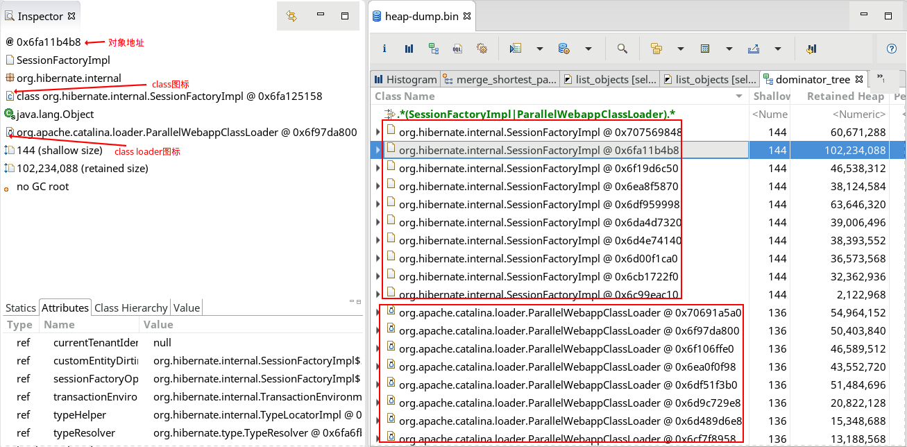 SessionFactoryImpl有10个实例,而ParallelWebappClassLoader有15个实例; - 各个