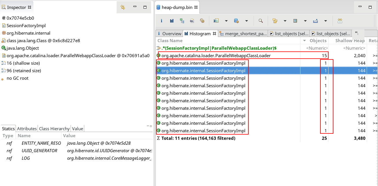 对上述两个目标过滤后可以发现,在Tomcat中确实存在10个同名的SessionFactoryImpl类,每个类均产生了一个实例,而ParallelWebappClassLoader虽然只有一个类,但却创建了15个实例。这和我们所预期的共识产生了明显冲突:
