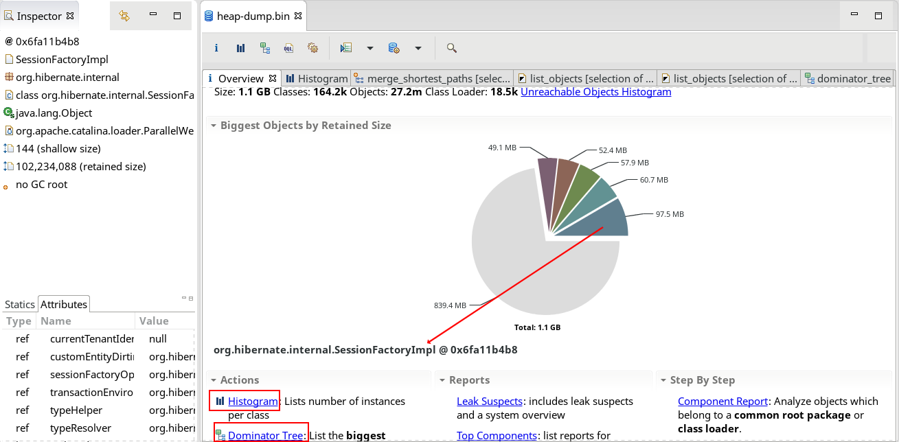 然后,打开Dominator Tree以检查当前占用内存最高的有哪些对象: