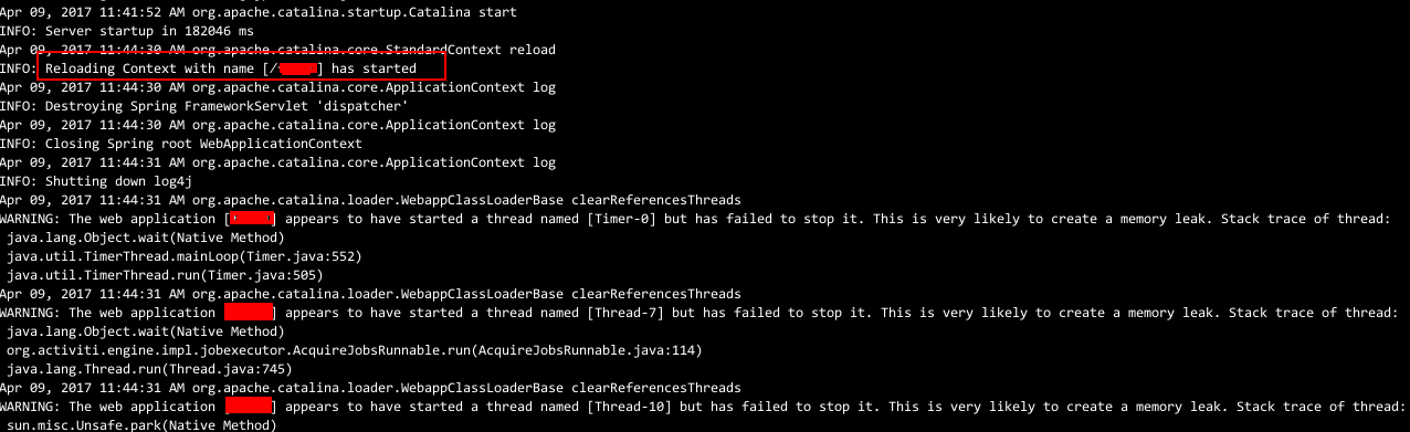 WEB-INF/classes/config.properties,而该文件会在org.springframework.beans.factory.config.PropertyPlaceholderConfigurer中通过ClassLoader#getResourceAsStream读取,从而被放入Tomcat的资源变更观察列表中,成为Tomcat的已加载资源; - 首次启动会使Tomcat触发至少两次重载,从Tomcat的输出日志中可寻找到重载痕迹;