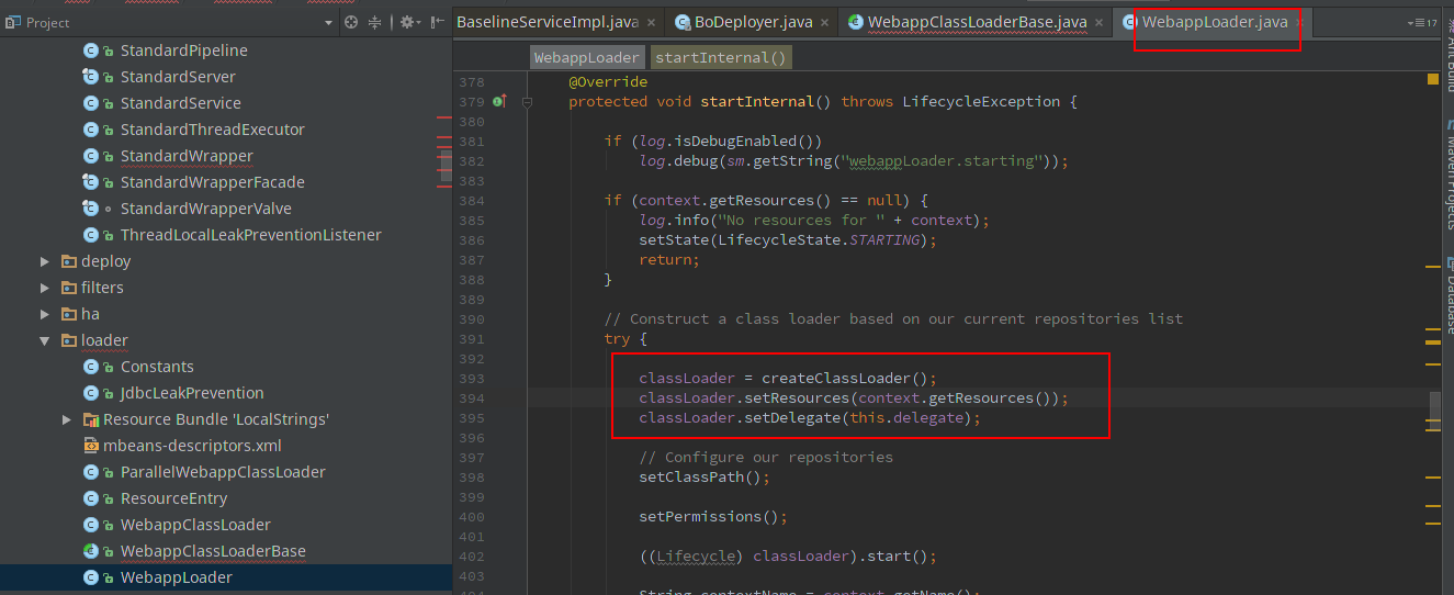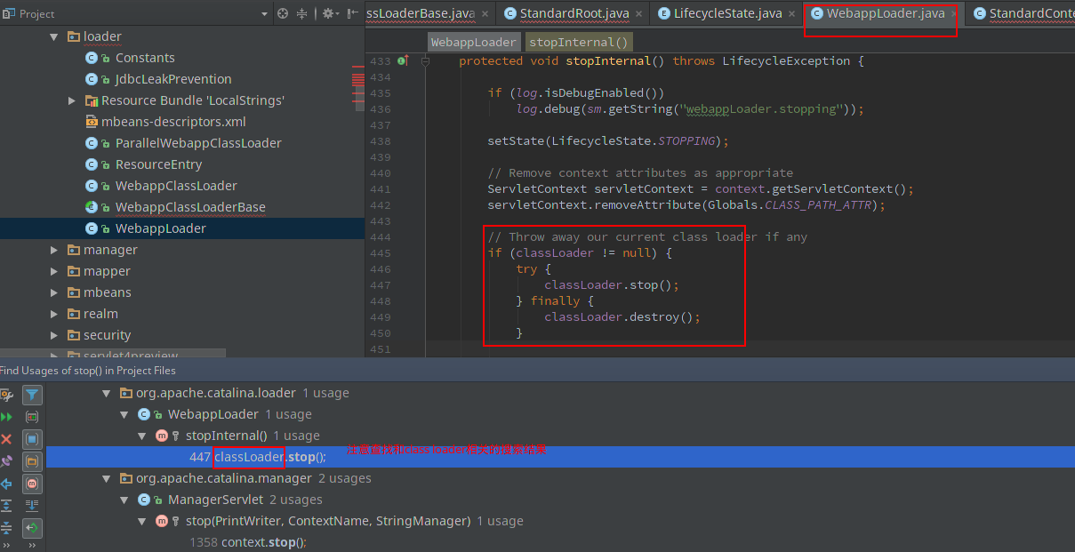 查找引用:org.apache.catalina.loader.WebappLoader(注:查找stopInternal的引用无法确定其真实调用位置)定位到:org.apache.catalina.core.StandardContext#startInternal