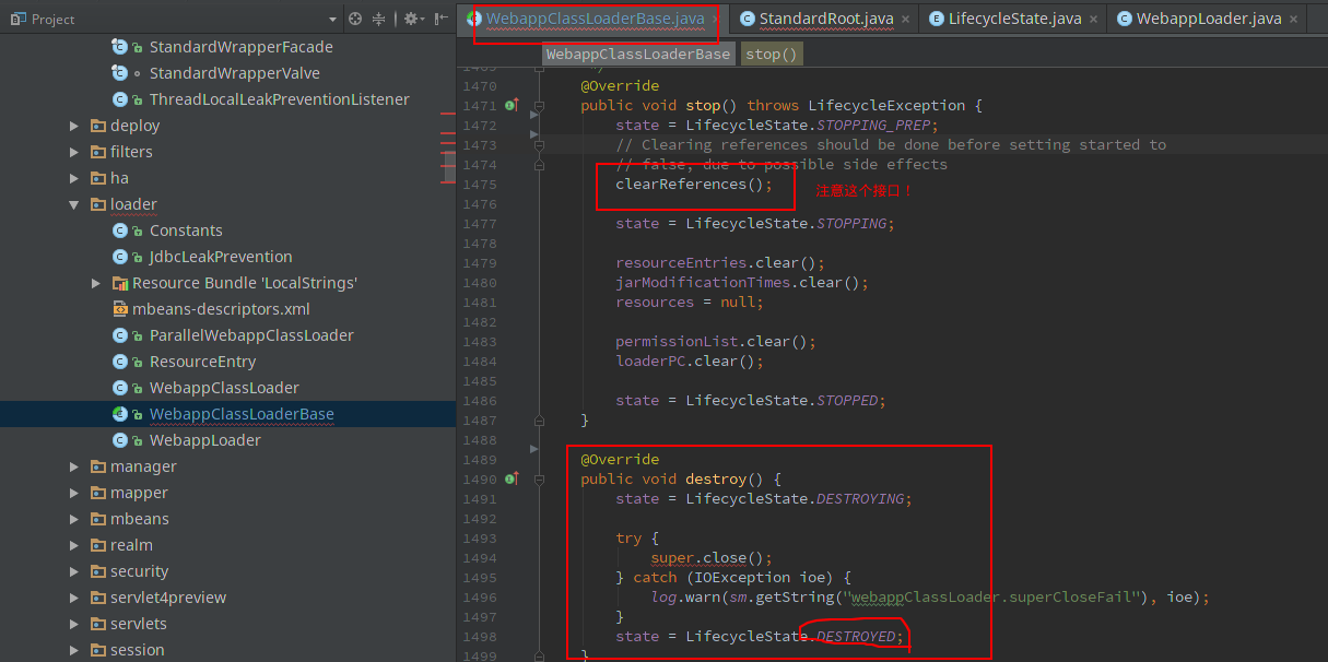 跟踪接口调用情况,可以发现在WebappLoader中实施了销毁动作: