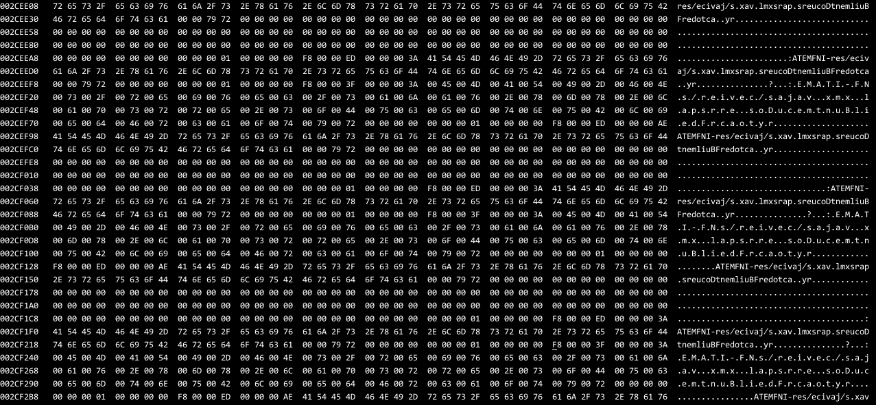 1 | 002CEEA8 00 00 00 00 00 00 00 00 00 00 00 01 00 00 00 00 F8 00 00 ED 00 00 00 3A 41 54 45 4D 46 4E 49 2D 72 65 73 2F 65 63 69 76 .......................:ATEMFNI-res/eciv |