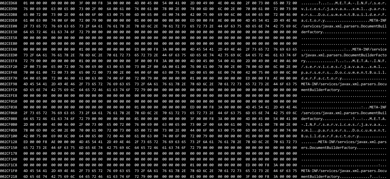 不过仔细辨别还是可以发现:每四个相邻字符反序再组合也就能够还原出正确的字符串。比如,截图中便可识别出一串字符:META-INF/services/javax.xml.parsers.DocumentBuilderFactory。