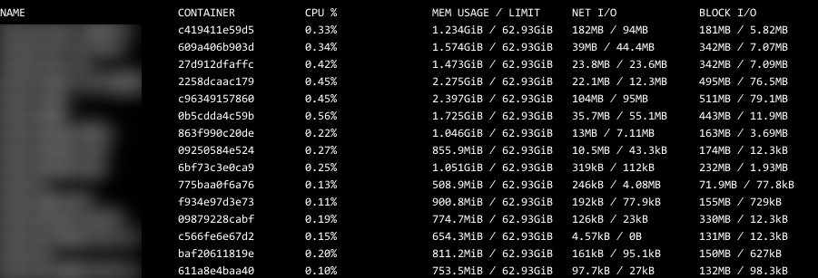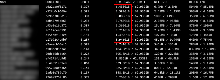 再查看哪些进程耗用内存较多,结果发现都是Docker容器内的应用进程消耗最多。那使用命令docker stats --format "table {{.Name}}\t{{.Container}}\t{{.CPUPerc}}\t{{.MemUsage}}\t{{.NetIO}}\t{{.BlockIO}}"看看各个容器的内存使用情况: