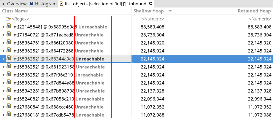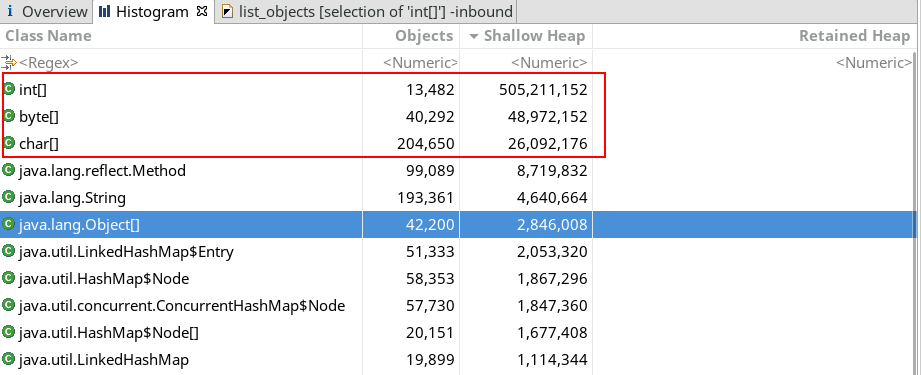 右键点击int[]并选择List objects -> with incoming references(PS:同样按Shallow Heap降序排序):