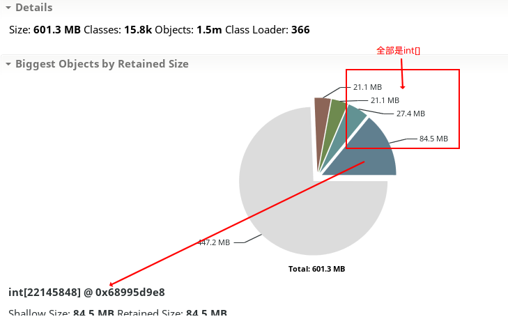 结果很出乎意料:int[]数组居然占用了数十兆内存,总计占了1/4!
