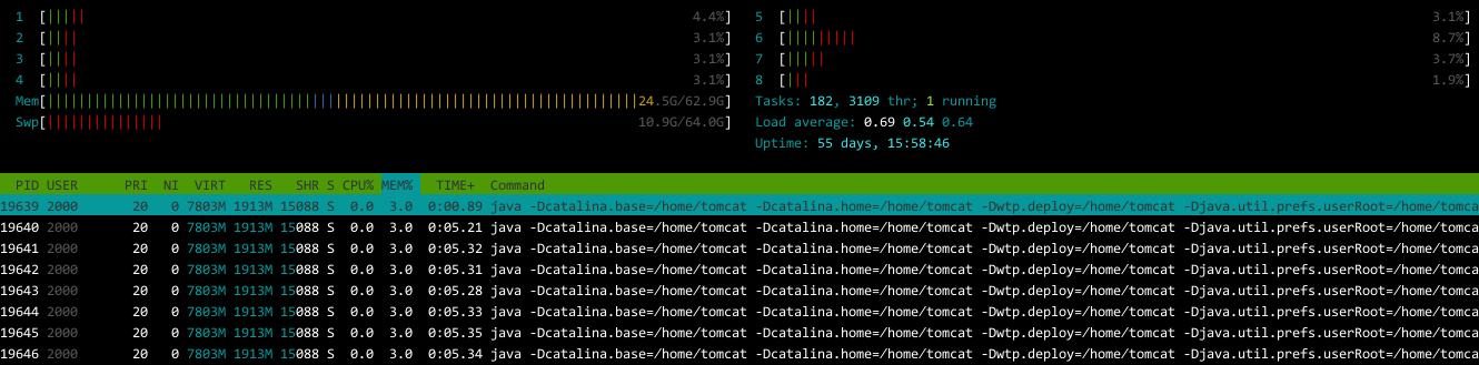 最近服务器的内存又在狂飙了,网关响应缓慢,Jenkins完成构建需要长达2个多小时。到底疯狂到什么程度呢?用htop命令看看: